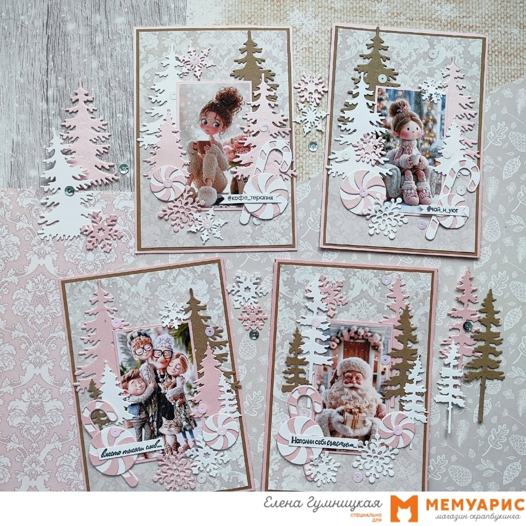Каждая карточка утопает в елочках и снежинках, а леденцы делают открытку сладкой.