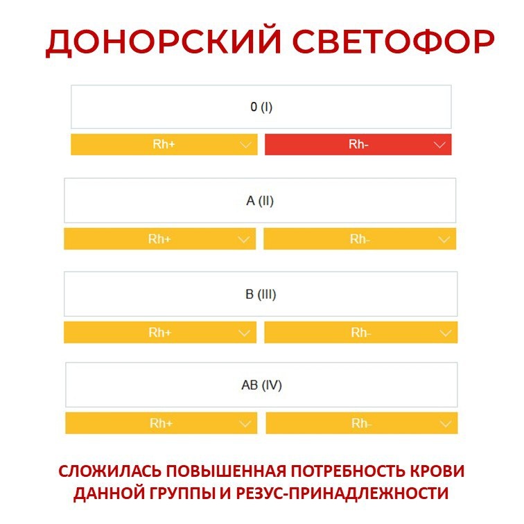 ! Напоминаем, что «Донорский светофор» — это наш онлайн-индикатор, который показывает, какие группы крови нужны нам прямо сейчас в большей степени. 🚦 Как читать наш светофор: 🔴 Красный: Острая потребность. Крови этой группы очень мало. 🟡 Желтый: Стабильная потребность. Крови этой группы недостаточно. 🟢 Зеленый: Запас достаточен. Но вы всё равно прийти и сдать кровь. Ситуация может измениться. ❗️Важный момент: Мы принимаем доноров с ЛЮБОЙ группой крови!