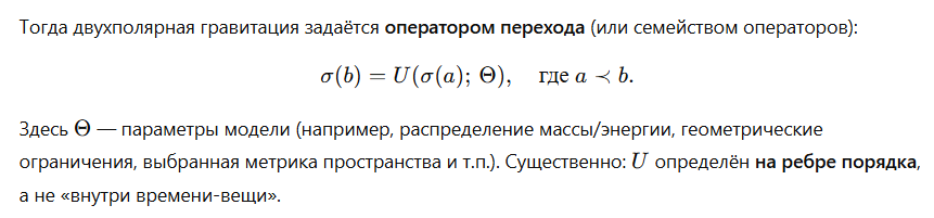 Отсюда следует обновлённая идея: двухполярная гравитация — это бинарное правило, которое связывает «состояние на событии» и «состояние на следующем событии по порядку».