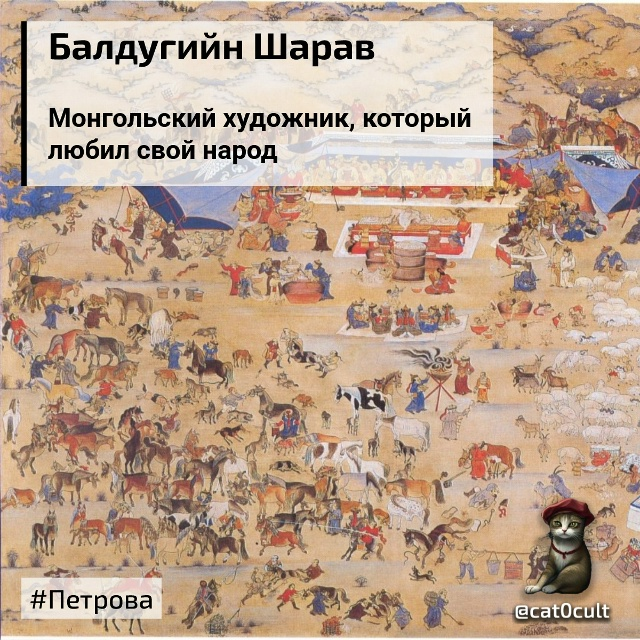 Начало XX века для Монголии выдалось таким же насыщенным, как и для всего мира. Выход из-под пяты династии Цин, десятилетие независимости и первый за много лет великий хан, приход красных к политической власти – эпоха перемен во всей красе. Художнику Балдугийну Шараву довелось жить в эти интересные времена: они в какой-то степени создали его, а он – современную монгольскую живопись. Шарав родился в 1869 году где-то на территории, название которой даже гуглу ни о чем не говорит, среди скотоводов, под ярким и чистым небом. Он не знал отца, и никто не знал его отца: говорят, им был странствующий лама – поэтому Шарав вместо фамилии получил отчество от деда Балдуу, став Балдугийном. О его детстве до 10 лет известно мало, и мы можем только предполагать, как это было: старая вера вечно-голубого неба; запах и шерсть скота; праздник «перекочевья», когда женщины выходят в лучших одеждах и выводят верблюдов, а вокруг резвятся дети, и их восклицания летят над бескрайними степями; монахи в красных