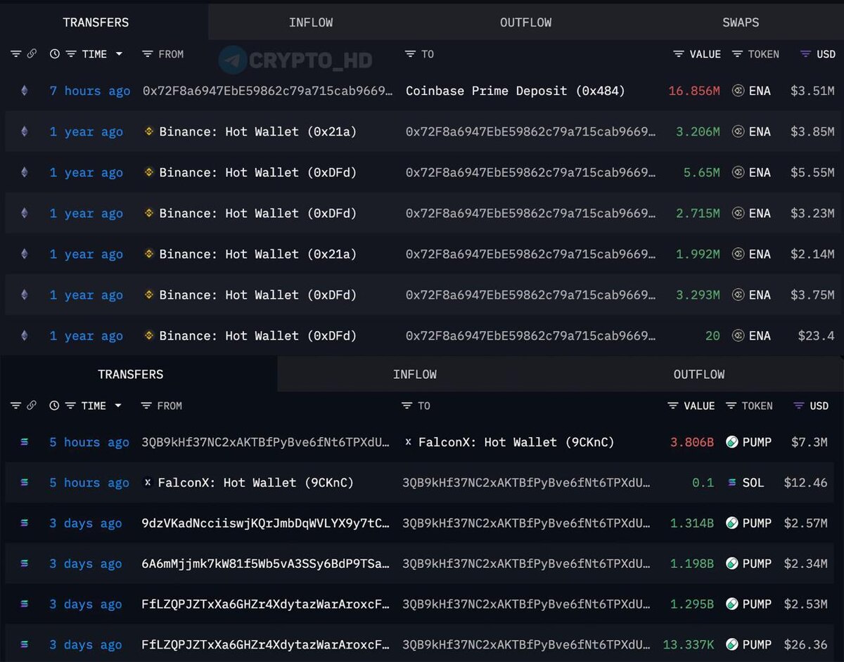 Крупный инвестор «0x72F8» отправил 16,86m #ENA ($3,51m) на Coinbase Prime. Эти токены были куплены около года назад за $18,53m по средней цене $1,1. Совокупный убыток = $15m (-81%). Кошелек: arkham Трейдер «3qb9kh» с сентября по начало ноября накопил 3,8b #PUMP на $19,5m по средней цене $0,00513. В итоге он продал весь объем токенов на FalconX примерно за $7,3m, зафиксировав убыток > $12m (-62%). Кошелек: arkham Crypto Headlines