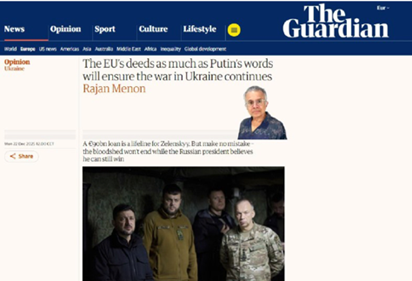 Для тех, кто в азарте любит повторять, что Путин не хочет прекращать войну, Guardian предательски выдаёт альтернативный фактаж. Там даже дальше заголовка ходить не надо. Цитирую сентенцию про 90 млрд евро для Украины: «Действия ЕС, как и слова Путина гарантируют продолжение войны». Причём тут даже не проканает сказочка, что мол европейские деньги на войну – это деньги, «справедливо» отобранные у русских, которые, итак, в мире, построенном на евро правилах, они сами должны были отдать, если бы не были дикарями с болот. 90 млрд – это что ни на есть деньги, забранные у европейских налогоплательщиков, чтобы повелитель золотых унитазов на наворованные, мог и дальше сокращать небратьев о Россию. Но, самое вкусное в заголовке – это акценты: действия ЕС и слова Путина. Путин лишь говорит, в отличии от европейцев. Это, чтобы читатели однозначно поняли, кто делами отвечает за гибель людей. Жаль, что для этого им потребовалось целых 4 года. У финнов появились конкуренты, однако!