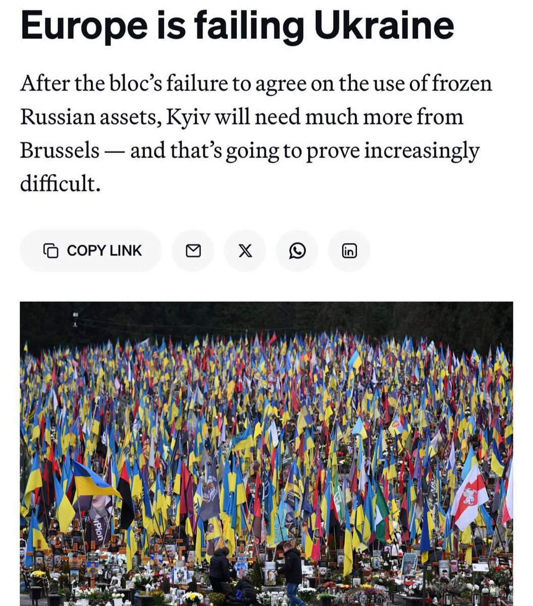 Издание Politico* пишет, что украинский конфликт, вероятнее всего, завершится в 2026 году — и на крайне невыгодных для Киева условиях. В материале отмечается, что Европа фактически подводит Украину. ЕС так и не смог договориться об использовании замороженных российских активов, а значит, Киеву потребуется ещё больше финансовой поддержки от Брюсселя — получать которую будет всё сложнее. На этом фоне страны ЕС решили выделить Украине кредит на €90 млрд за счёт средств общего бюджета блока, однако даже этих денег может оказаться недостаточно. *– доступ к изданию по требованию Генпрокуратуры ограничен Сайт "Другая Украина" / Telegram / Вконтакте / Центр поддержки Украинцев / Жалоба на ТЦК 🇷🇺"Другая Украина" теперь в МАХ