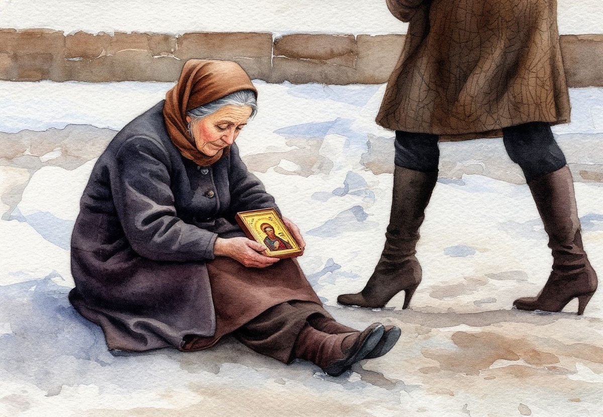 Рядом с ними сидела на коленях Анна, для тепла подложив на гранит разобранную картонную коробку. Сегодня бабуля воссоздавала новый образ. Она сидела совершенно неподвижно, руки покорно сложены на коленях. Перед ней лежала картонка, где большими буквами была написана просьба подать на операцию для внучки. Глаза Анны смотрели вверх и не двигались, такой запоминающийся взгляд, обращенный к небу. Лицо не выражало ничего, кроме совершенно нереального, нечеловеческого смирения и покорности судьбе. В то же время в нём читалось обещание нечеловеческой благодарности любому, кто поможет деньгами. Дополняла картину какая-то измочаленная банка, в которую прохожим надлежало кидать денежные знаки.