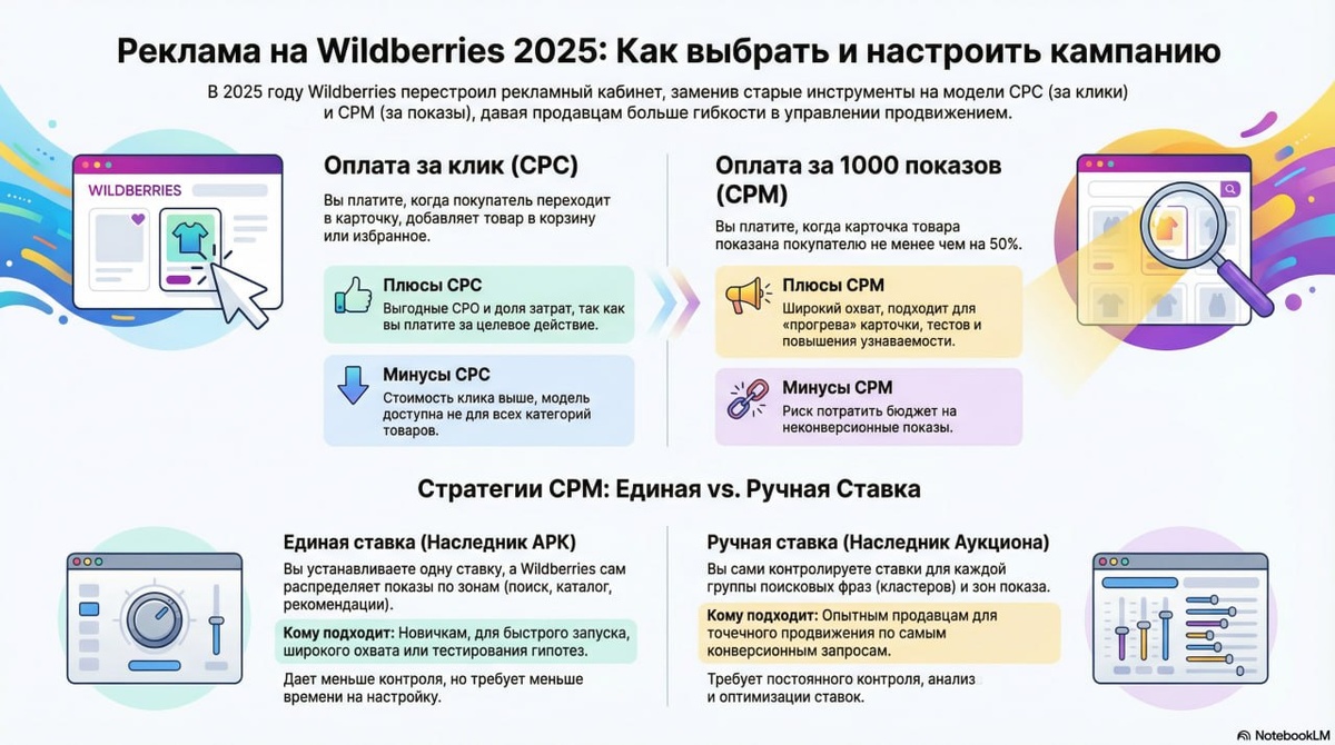 Как правило, в конце года, все подводят итоги. Но обычно народ любит про себя писать, а я вот в про рекламу вам подведу итоги😅 Так что присаживайтесь поудобнее, щас будет лонгрид🤪 В 2025 году Wildberries перестроил рекламный кабинет, заменив старые инструменты на модели СРС (за клики) и СРМ (за показы). Якобы, давая продавцам больше гибкости в управлении продвижением. Ну, ладно, допустим - поверим👍 😊Оплата за клик (СРС) Вы платите, когда покупатель переходит в карточку, добавляет товар в корзину или избранное. ➕Плюсы СРС Выгодные СРО (Cost Per Order=Стоимость за заказ) и доля затрат, так как вы платите за целевое действие. ➖Минусы СРС -Система сама подбирает запросы для показа (очень рисково, ХЗ, что она там подберет, особенно если у вас в СЕО повалялись все кони, какие могли); -Стоимость клика выше, и модель пока доступна не для всех категорий товаров, и прямо скажем минимальная стоимость клика там близится к вашей зашкварной, на которой вообще нельзя работать. 😊Оплата за