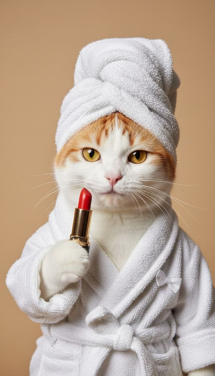 🤣 Создай портрет, не меняя объекта. мордочка кошки как на эталонном фото. Очаровательная кошка в стиле (утро в спа). Кошка одета в миниатюрный мягкий белый махровый халат с бантом на рукаве, на голове — аккуратно закрученное белое полотенце в виде тюрбана. В одной лапке она уверенно держит открытую ярко-красную помаду в золотистом футляре. У неё милое выражение мордочки. Фон однотонный, теплого бежевого (песочного) цвета. Мягкое студийное освещение, высокая детализация шерсти и текстуры ткани, фотореализм, эстетика бьюти-блога ❤️ Ставьте реакции! 👉Все ссылки ТУТ 👉канал в Дзен 💰Donate