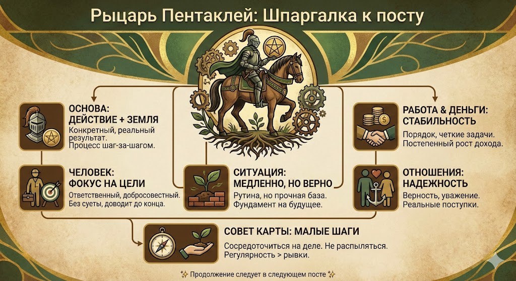 Рыцарь Пентаклей В одном из прошлых постов я показывала простой лайфхак, который помогает понять все придворные карты без заучивания. И сегодня мы начнем разбирать каждую карту по отдельности. На повестке дня Рыцарь Пентаклей. Карта, которую часто недооценивают из-за внешней медлительности. Основа карты Рыцарь — это движение, действия, процесс. Пентакли — земля: работа, деньги, быт, тело, стабильность. Если соединить эти два значения, получается простая формула: действие ради конкретного и реального результата. Это не про порыв и не про вдохновение. Это про процесс, в котором человек находится в разгаре своих планов и спокойно, шаг-за-шагом, их реализует. Если карта показывает человека Рыцарь Пентаклей — это человек, который: — не обещает лишнего — делает, а не говорит — идёт к цели шаг за шагом — не любит резких перемен Это тот, кто не говорит громких слов, а просто каждый день делает свою работу. В характере у него: • ответственность • добросовестность • исполнительность • си
