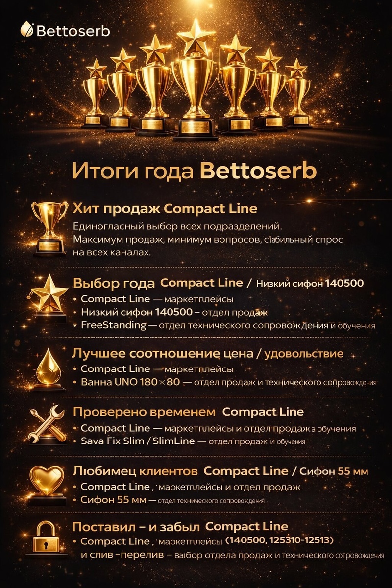 Конец года — время подводить итоги и вручать награды тем продуктам, которые весь год работали за нас: продавались, устанавливались, радовали клиентов и… почти не звонили в техподдержку 😉 В этом году мы собрали результаты сразу трёх команд — маркетплейсов, отдела продаж и отдела технического сопровождения и обучения. Вот как распределились награды. 🏆 Итоги года Bettoserb в номинациях: Хит продаж Compact Line Абсолютный лидер года. Отлично продаётся, стабильно устанавливается и понятен рынку. Редкий случай, когда все отделы единодушны. Выбор года Compact Line — по версии маркетплейсов Низкий сифон 140500 — выбор отдела продаж Решение, которое идеально зашло в мебельные тумбы, под раковины над стиральной машиной и другие сложные по высоте сценарии. FreeStanding — выбор отдела технического сопровождения и обучения Эффектный внешний вид + понятный монтаж = спокойная эксплуатация. Лучшее соотношение «цена / удовольствие» Compact Line — маркетплейсы Ванны Bettoserb — выбор отдела прод