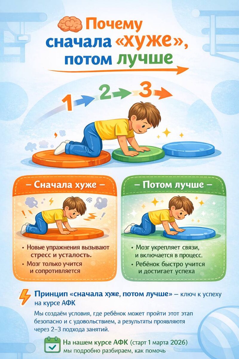 Когда ребёнок начинает занятия по адаптивной физической культуре, часто кажется, что всё идёт «не так». Он быстрее устаёт, отвлекается, повторяет движения медленно или делает их «неправильно». Это пугает. Но важно знать — это нормально. Наш мозг и тело работают по принципу адаптации. Любая новая двигательная задача сначала воспринимается как стресс. В этот момент нервная система: — оценивает безопасность — ищет опору — привыкает к нагрузке И только после этого может включаться в обучение. Поэтому на первых занятиях мы часто видим не «результат», а настройку системы. И именно здесь особенно важно: — не торопить — не усиливать требования — не делать выводы «не подходит» 📌 «Сначала хуже, потом лучше» — это не оправдание. Это закономерный этап. Если пройти его спокойно и правильно, дальше появляется то, ради чего всё и начиналось: — включённость — устойчивость — постепенный прогресс Если откликается — поставьте «♥️».
