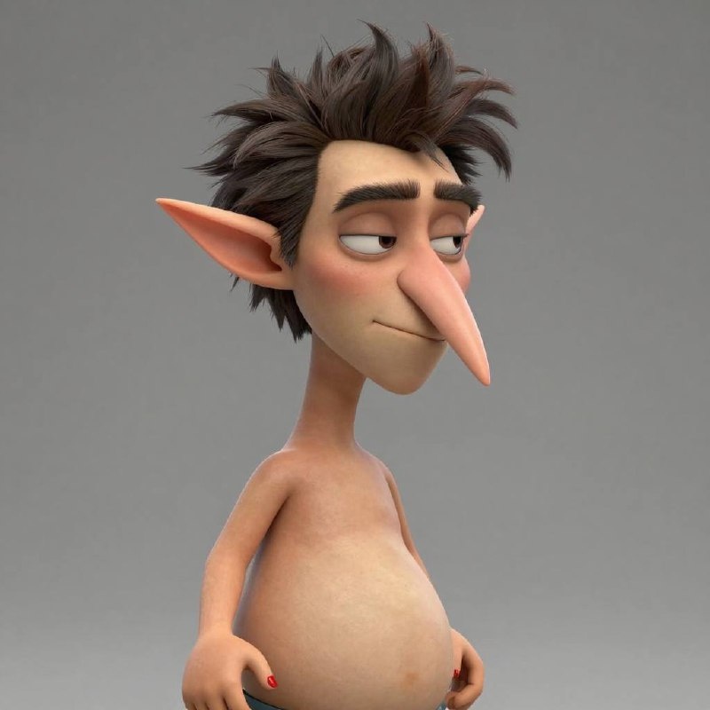 Create a fictional character, that has pointed ears, bushy eyebrows, half-closed eyelids and a crooked nose