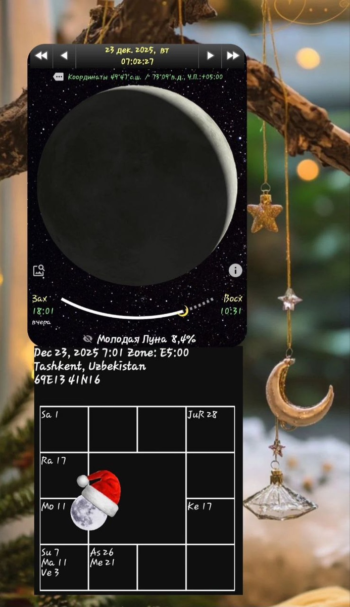 🌛🎄🎄 Ведическая Астрология Молодая Луна в Козероге. РетроЮпитер. 🐦🌛 Молодая Луна сегодня расставляет акценты на важных задачах, которым стоит уделить внимание. Козерожья Луна может быть напряжена от того, что максимально сосредоточена, поэтому не пренебрегайте сном, особенно в эти суетные дни. ⛸️🌛 Энергии сейчас достаточно реактивные, поэтому можно запускать интересные проекты, дела, пусть даже символически- открыть счет в банке. Если всё продумано до мелочей, а вы ждали подходящий момент-вот он. Многое сегодня решается каким-то чудесным образом, даже, если ситуация покажется патовой, стоит верить в чудо той Великой Силы, что поддерживает всё. Девиз дня: Чудо происходит, когда усилия встречают готовность к невероятному и надежду Легкого вам дня☀️берегите себя и близких © С уважением, Юля 🌟