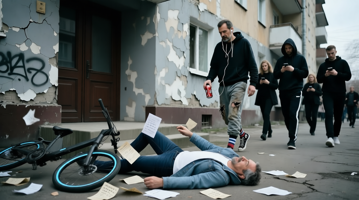 Кадр третий: Мой непосредственный сосед, с которым мы вчера полчаса обсуждали во дворе важность комьюнити и взаимовыручки. Он шёл из машины с пакетами. Наши глаза встретились. В его я увидел мгновенный расчёт: «Связываться? Проблемы? Скорая, объяснения...» Он сделал вид, что меня не узнал, и резко свернул в подъезд.
