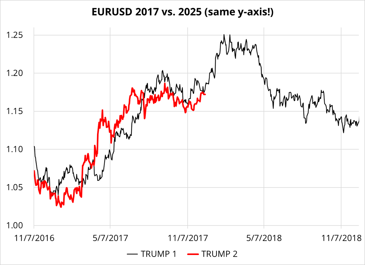 Помните, я писал про «сравняшки» на инфляции в США? Там сейчас другие нашли. На курсе EURUSD. Оказывается, текущая динамика валютной пары повторяет саму себя во времена первого президентства Дональда Фредовича Трампа. Типа, ослабляет нацвалюту.