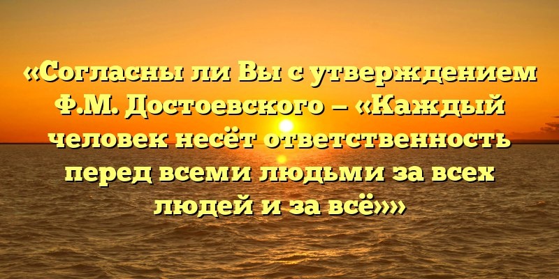 М. Достоевского — «Каждый человек несёт ответственность перед всеми людьми за всех людей и за всё»» 7 лучших сочинений на тему «Согласны ли Вы с утверждением Ф.М. Достоевского — «Каждый человек несёт ответственность перед всеми людьми за всех людей и за всё»» Публикуем свежие сочинения 2025 года по теме «Согласны ли Вы с утверждением Ф.М. Достоевского — «Каждый человек несёт ответственность перед всеми людьми за всех людей и за всё»». «Согласны ли Вы с утверждением Ф.М. Достоевского — «Каждый человек несёт ответственность перед всеми людьми за всех людей и за всё»»: Вариант 1 Я думаю, что согласен с утверждением Ф.М. Достоевского о том, что каждый человек несёт ответственность перед всеми людьми и за всё. Мне кажется, что… #Сочинения Подробнее: https://2025.obr.prime-name.ru/literatura/sochineniya/soglasny-li-vy-s-utverzhdeniem-f-m-dostoevskogo-kazhdyj-chelovek-nesyot-otvetstvennost-pered-vsemi-lyudmi-za-vsex-lyudej-i-za-vsyo.html
