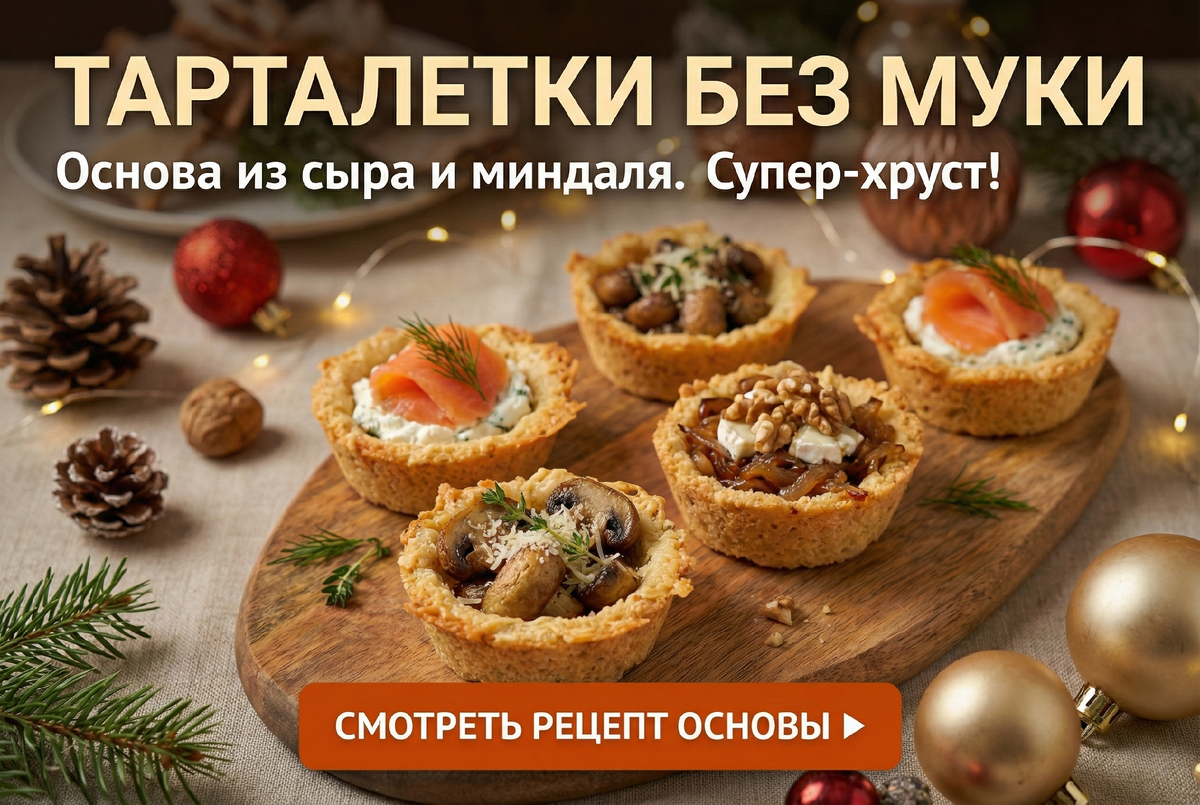 Они получаются золотистыми, с ярким сырно-ореховым вкусом и, самое главное, — они держат форму часами, не размокая даже от сочной начинки. Почему мы используем миндаль и сыр? Из этого количества получится 10–12 тарталеток (зависит от размера форм). Ингредиенты: Инвентарь: Вам понадобятся силиконовые формочки для кексов/маффинов. Приготовление: Эти тарталетки сами по себе имеют насыщенный вкус, поэтому начинка должна быть деликатной. Можно ли есть вкусно, разнообразно, с деликатесами и при этом худеть? Да. Секрет не в голоде, а в замене ингредиентов. Замените муку на миндаль, сахар на стевию, а трансжиры на авокадо — и ваше тело скажет спасибо