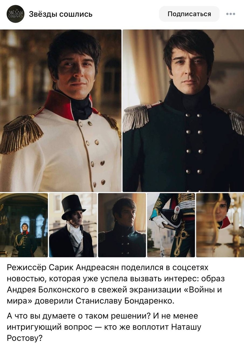 С утра увидела новость про экранизацию «Войны и мира»... Косплей сериала BBC, а не экранизация Толстого, судя по выбору актёра на роль Болконского. Разбираемся вместе. Днем ходила на встречу с любимым театральным режиссером П.Ю.Шерешевским. Такой контраст с новой экранизацией... Я очень люблю театр и особенно – постановки классики, переосмысленные режиссёром. Все эти переосмысления, на мой взгляд, должны быть мотивированы, продуманны, зритель удивляется и как бы вступает в диалог и с текстом, и со спектаклем. Неожиданного выбора актеров (несоответствие по внешности или по возрасту, типажу, переосмысление характера) должно дать какое-то пояснение, какая-то игра. Нельзя просто взять красавицу на роль матери Татьяны, уже очень возрастного актера на роль Онегина, и никак это не объяснить (к новости про Болконского выше). У меня уже очень сильное предубеждение против постановки эпопеи Толстого. Это, видимо, будет чтение текста актерами, подобранных, как я понимаю, по кумовству. Лично у мен