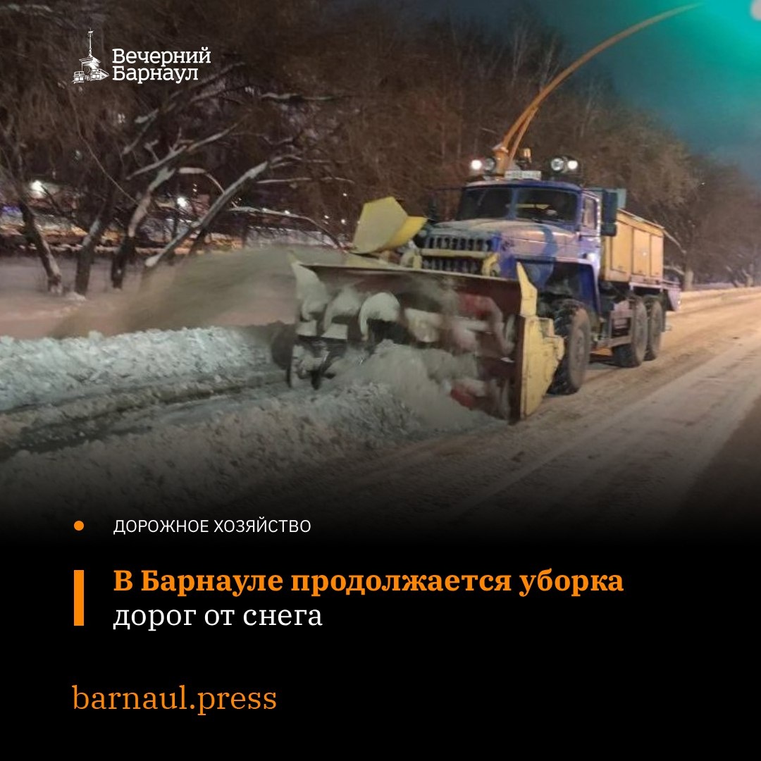 В них задействуют 88 единиц техники и 134 специалиста. В ночную смену на дорогах и тротуарах города работало 148 единиц техники. Механизированную очистку автодорог провели на улицах Ленинградской, Панфиловцев, Энтузиастов, Сухэ-Батора, Георгиева, 50 лет СССР, Шумакова, Советской Армии, Транзитной, Заринской, Бабуркина, Автотранспортной, 65 лет Победы, 280-летия Барнаула, Северо-Западной, а также на других участках. Снег вывозили с улиц Антона Петрова, Попова, Геблера, Чкалова, 65 лет Победы, Энтузиастов, Эмилии Алексеевой, Молодёжной, Димитрова, Павловского и Змеиногорского трактов, а также с проспектов Ленина, Строителей, Калинина, площадей Победы, Баварина и Советов. Фото: barnaul.org 📬 Подписывайтесь на наш канал в MAX @barnaul