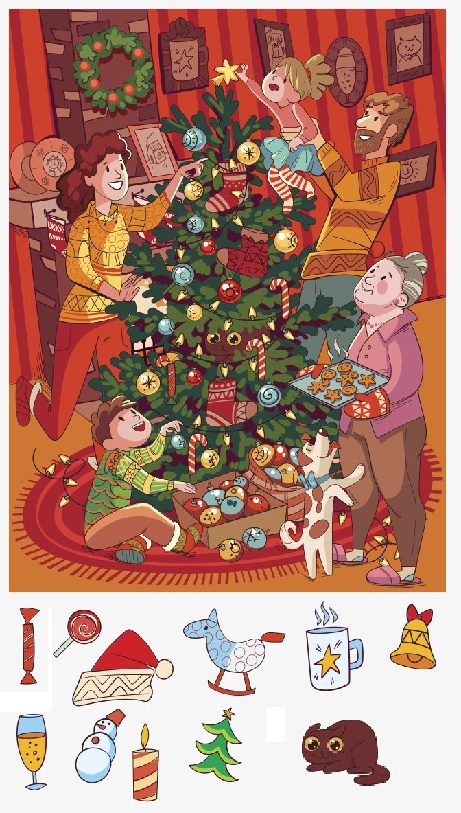 Привет, друзья искусства! Это финальная в этом году субботняя загадка на канале. Поэтому я постарался найти максимально яркую и максимально новогоднюю головоломку. Чтобы она подняла настроение и принесла предчувствие праздника даже самым отъявленным скептикам. Ведь что может быть веселее, чем поиски кота, спрятавшегося от предпраздничной суеты. Кроме бедного котёночка на картинке спрятано 10 атрибутов праздника, которые вам и нужно отыскать. Дерзайте и с наступающим! Если понравилась загадка — поставьте лайк и подпишитесь на канал. Если хотите ещё немного новогоднего настроения, то вот вам ещё 3 новогодних загадки: