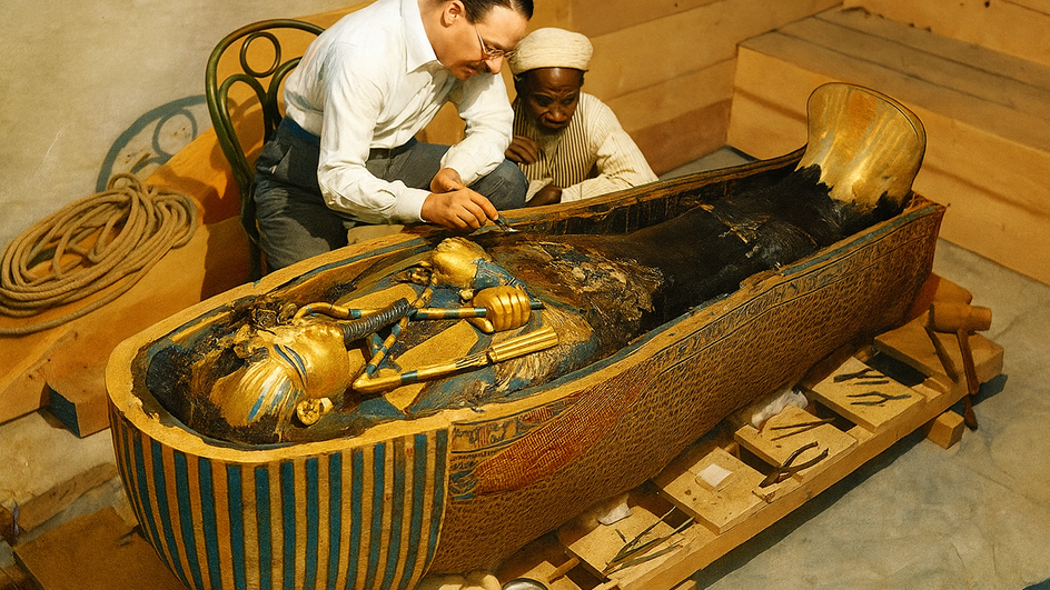 Человек, который первым сломал печать. Человек, который первым вошел внутрь. Человек, который лично работал с мумией, отделяя присохшие ткани и снимая золотую маску (да, процесс был довольно решительным, с использованием нагретых инструментов).