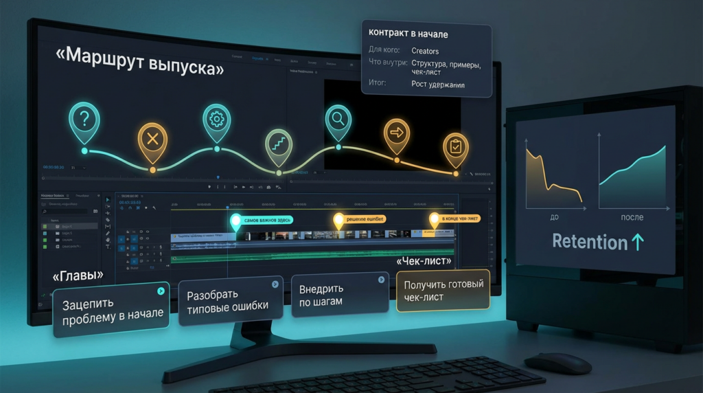 «Если удержание проседает на первых минутах — проблема часто не в контенте, а в отсутствии маршрута. Сейчас покажу, как разбить выпуск на блоки, подписать главы так, чтобы по ним кликали, и где ставить акценты. В конце — чек-лист.»