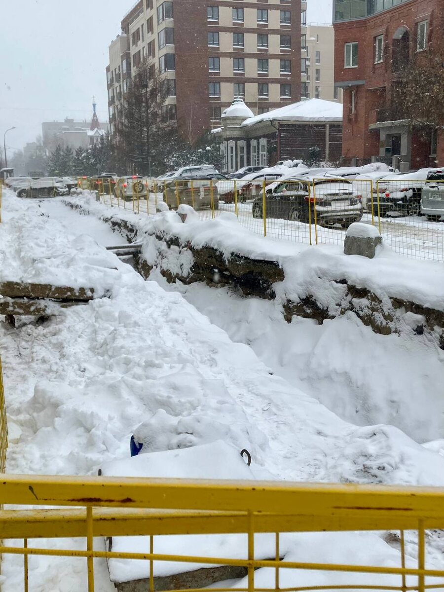 Брошенную энергетиками разрытую дорогу в центре Новосибирска завалило снегом