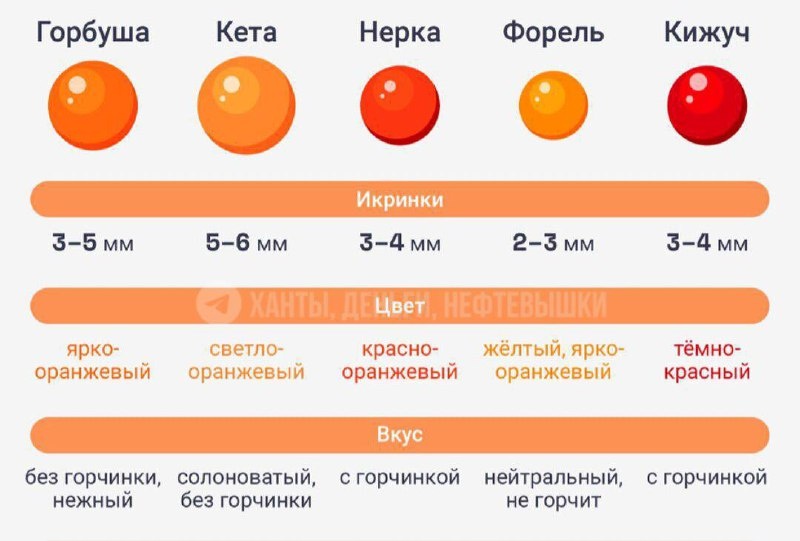 🧡Икра горбуши - содержит Омега-3 и Омега-6, а также витамины группы В, А, Е, Д и К. Имеет легкий привкус горечи. 🧡Икра кеты - богата витаминами А, Д, Е, кальцием, фосфором и йодом. Долго сохраняет свою форму и обладает насыщенным вкусом. 🧡Икра нерки - насыщена богатым составом витаминов и минералов, включая железо, цинк и магний. Горьковатый вкус с рыбным ароматом. 🧡Икра форели - богата витаминами группы А, В1, В2, С, Е, РР, калием, натрием, магнием. Имеет нейтральный вкус без горечи. 🧡Икра кижуча - обогащена витамином Д и фолиевой кислотой. Имеет горький привкус. Подписаться | Прислать новость | Дать «буст» | Мы в MAX