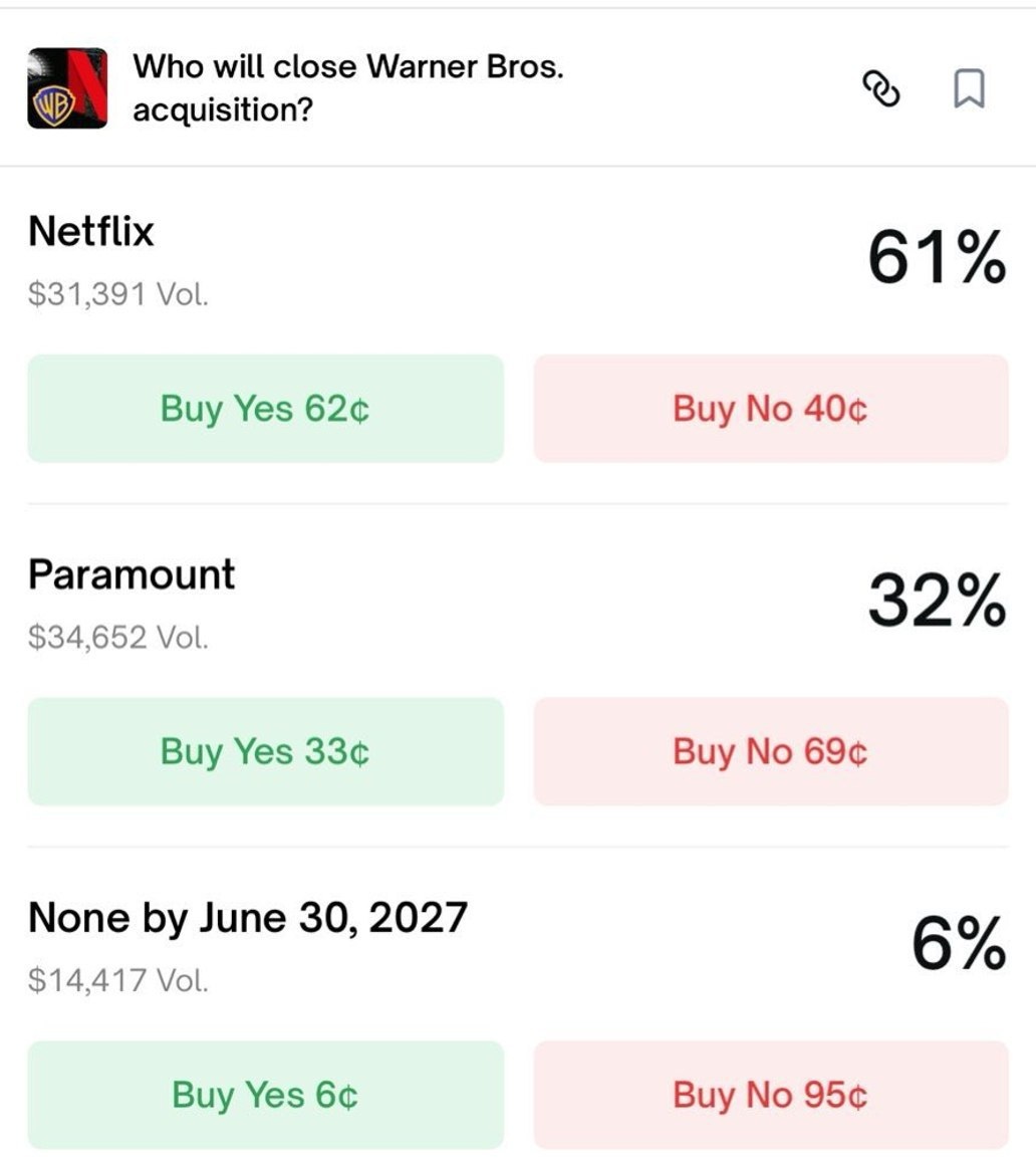 🔸 Шансы Netflix на заключение сделки с Warner Brothers снизились на Polymarket с 80% до 61
