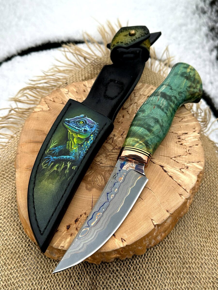 ! 🌊 Ламинированный дамаск с медью и воронением — уникальный сплав традиций и современных технологий. Такой клинок отличается не только выразительным рисунком, но и высокой прочностью: *спуски от середины* делают нож устойчивым к боковым нагрузкам, что особенно важно для охотников, туристов и коллекционеров. 🔪 Твердость 62 HRC — профессиональная острота и износостойкость: нож заточен до бритвенной остроты. 🌳 Рукоять из мокумэ-ганэ и стабилизированной карельской берёзы зелёного цвета — комфортный хват, антискользящие свойства, изысканный внешний вид. 🖤 В комплекте — *формованные ножны из кожи растительного дубления* с авторским рисунком: надёжно, стильно, долговечно. Цена: 63 353 ₽ *Единственный экземпляр — для истинных ценителей ручной работы и уникальных изделий!* 📲 Для заказа пишите в Telegram: [@Nazarklinokbot](https://t.me/Nazarklinokbot) Или на WhatsApp: [wa.me/79101343831](https://wa.me/79101343831) #КузницаНазарова #ручнаяработа #дамаск #эксклюзив #ножевоеискусство #под