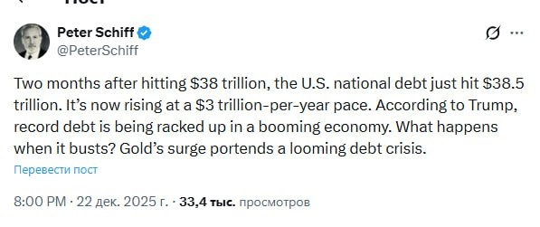 Сейчас он растёт темпами около $3 трлн в год. По словам Трампа, рекордный долг накапливается на фоне процветающей экономики. Что же произойдёт, когда этот рост закончится обвалом? Резкий рост цен на золото предвещает надвигающийся долговой кризис.