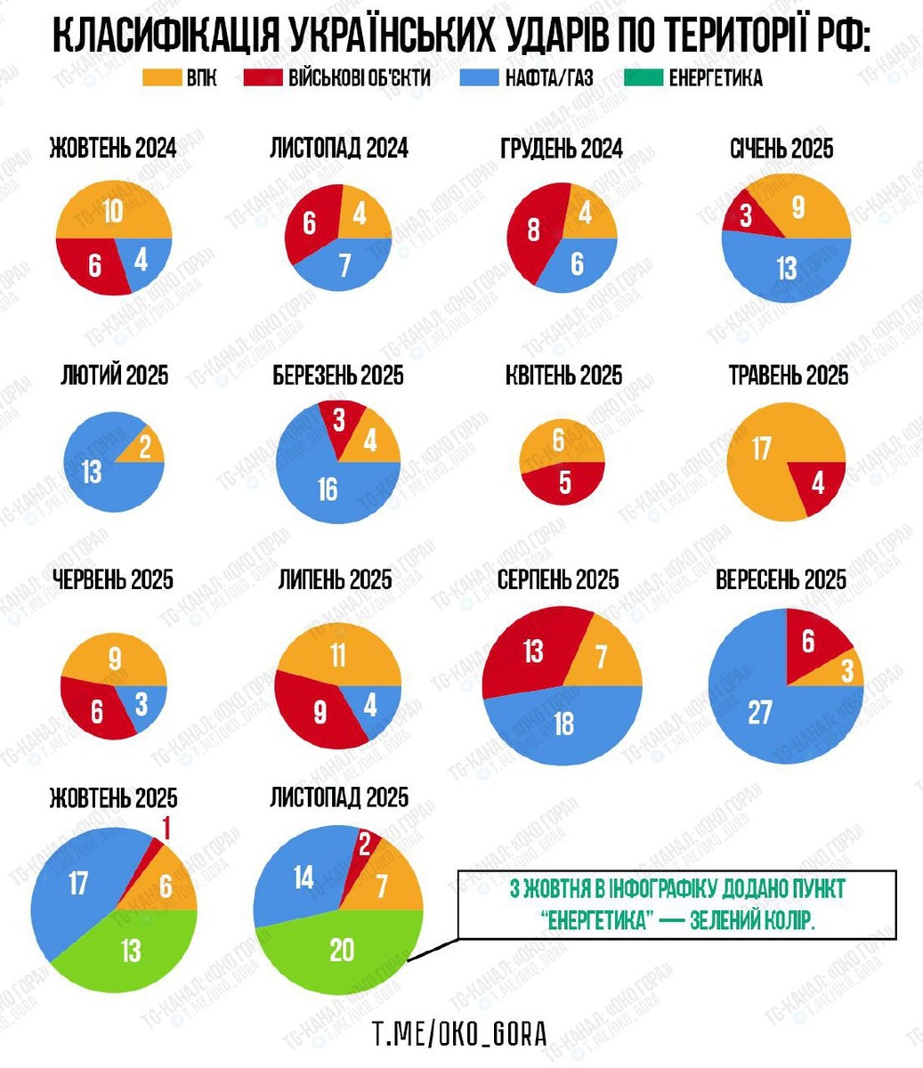 ): Ноябрь стал рекордным месяцем по количеству зафиксированных ударов по РФ за всё время полномасштабной войны. Классификация в %: 🟢Энергетика – 46% 🔵Нефть/Газ – 32% 🟠ВПК – 16% 🔴Военные объекты – 5% Количество ударов влияет на размер круга. Сальное Дифлопэ