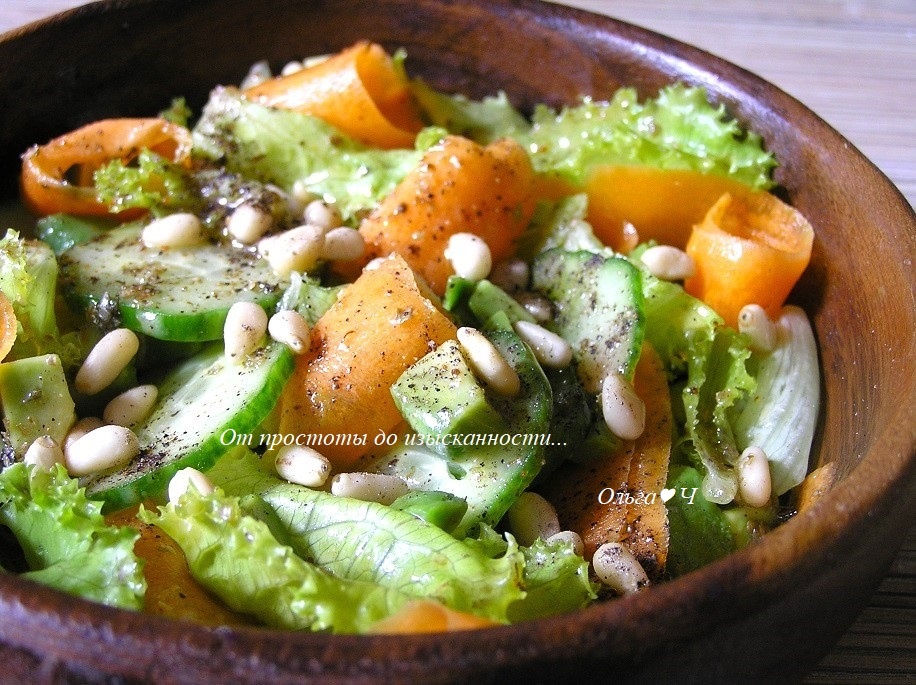 соль, смесь перцев по вкусу Приготовление: Для заправки смешайте все ингредиенты. Огурец нарежьте кружочками, морковь - тонкими пластинами с помощью овощечистки. В салатники выложите листья салата, посолите, поперчите, добавьте огурец и морковь. Авокадо нарежьте кубиками, добавьте в салат. Полейте салат заправкой, посыпьте кедровыми орешками и подавайте. Приятного аппетита! Вам также могут понравиться: