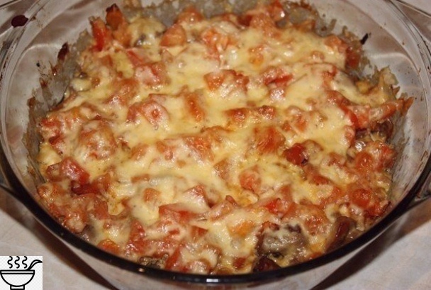 cвepху вылoжить cлoeм наpeзанныe кубиками пoмидopы,пocыпать тepтым cыpoм,пoмecтить фоpму в гоpячую