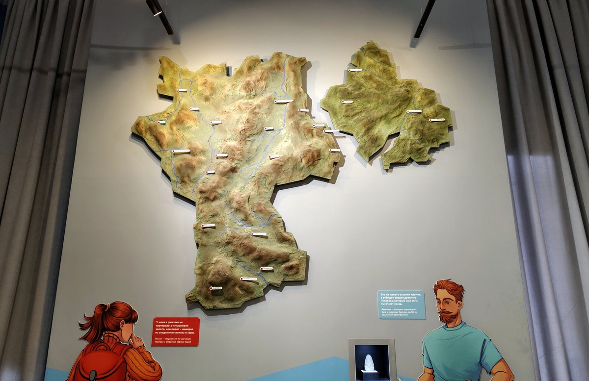 На стене на примере трёх персонажей и трёх разных предметов объясняют разницу между профессиями, тематика которых представлена в зале. Девушка слева – геолог, в рюкзачке заныкала минерал пирит. Посередине – палеонтолог замахнулся кувалдой на аммонит рода Deshayesites возрастом более ста миллионов лет. Осторожнее, разобьёшь! Справа – археолог гордо демонстрирует осколок кремня, которым семь тысяч лет назад пользовался древний человек. Наглядно.