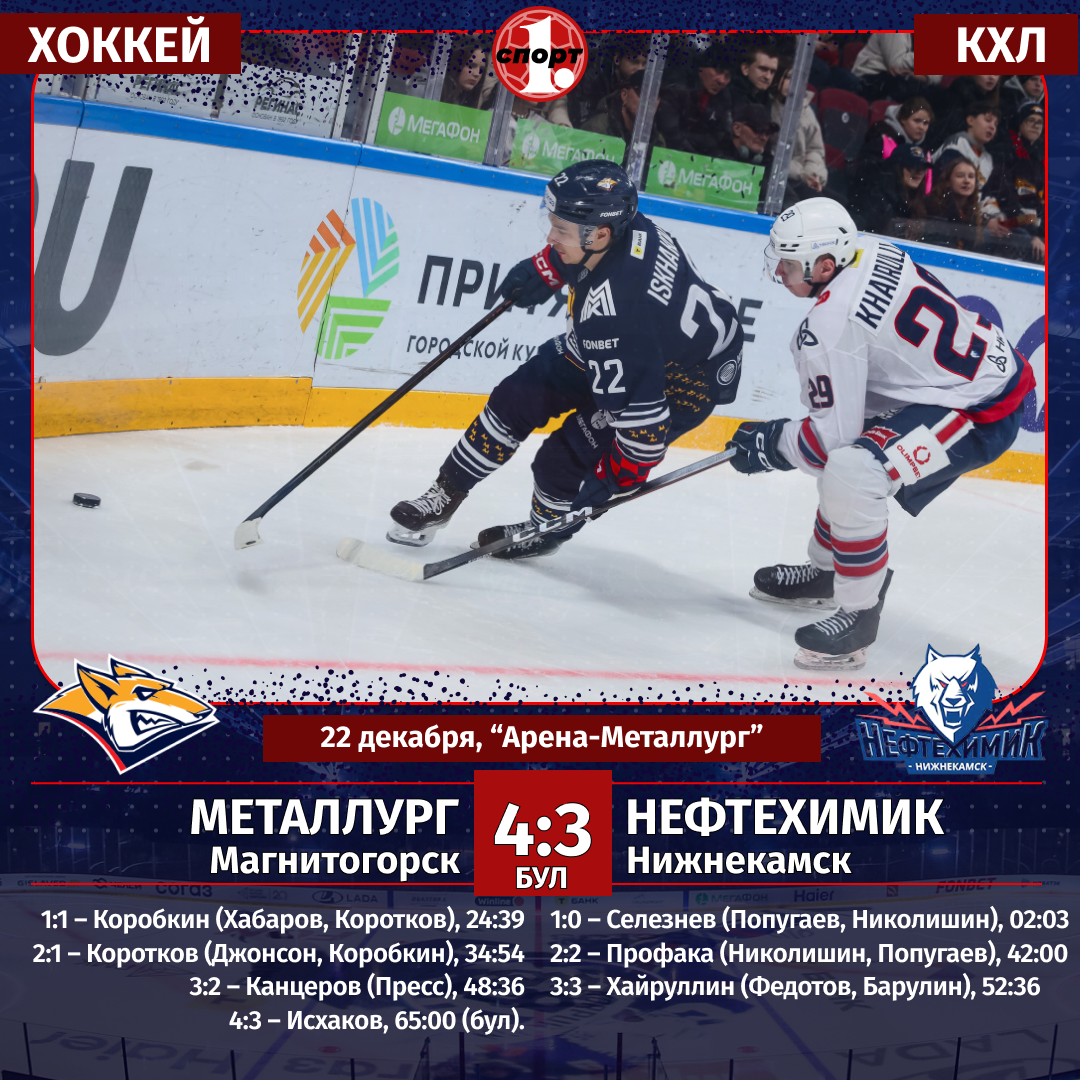 Хоккеисты магнитогорского «Металлурга» второй раз в сезоне обыграли в чемпионате КХЛ нижнекамский «Нефтехимик». На этот раз южноуральцы сломили сопротивление клуба из Татарстана, победив его по буллитам. У «сталеваров» гол-шедевр на свой счет записал Егор Коробкин, а решающий штрафной бросок исполнил Руслан Исхаков, сообщает корреспондент ИА «Первое областное». В текущем чемпионате КХЛ команды уже трижды встречались между собой. В Нижнекамске оба раза победили хозяева площадки (5:3 и 2:1 от), а в Магнитогорске подопечные Андрея Разина в суперрезультативном матче взяли верх со счетом 9:6. Событийным получился и нынешний матч между командами. «Нефтехимик» в очередной раз показал, как играть против лучшей команды лиги. Нижнекамцы доставили немало проблем магнитогорцам: первыми открыли счет, завершили первый период в свою пользу. И даже две заброшенные шайбы хозяев льда не остудили пыл клуба из Татарстана. В дебюте третьего периода «Нефтехимик» сравнял счет. Благодаря усилиям Романа Канцер