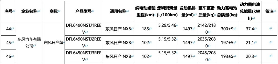 22 декабря мы обнаружили информацию о запасе хода новой версии Dongfeng Nissan в опубликованном (планируемом к выпуску) перечне моделей «Каталога автомобилей, пользующихся льготами по снижению налога на транспортные средства и суда и относящихся к энергосберегающим и новым энергетическим транспортным средствам» (81-й выпуск). Речь идёт о совершенно новом среднеразмерном/крупном SUV под брендом Dongfeng Nissan — Nissan NX8 (параметры | запрос цены) в версии с увеличенным запасом хода (range-extender).