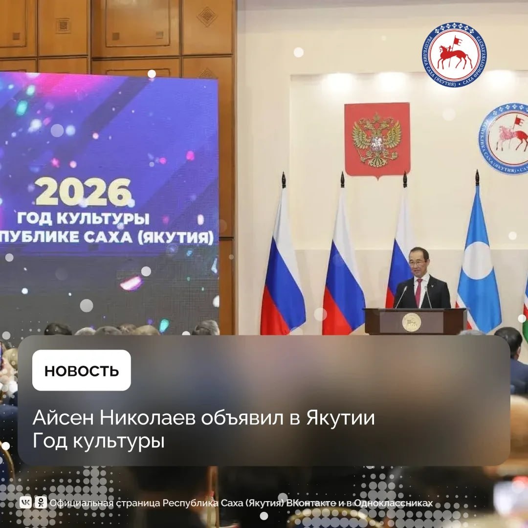 🔹Глава республики отметил, что укреплять идентичность многонационального народа, общие нравственные ориентиры, единую волю к развитию – вот к чему надо стремиться. «У нас есть крепкая опора – наша многогранная самобытная культура. Созданная на фундаменте общероссийской и мировой культуры, она вобрала в себя наследие и традиции народов Якутии. Перед лицом испытаний именно культура наделяет нас особой стойкостью, становится источником силы духа. Чтобы традиционные культурные и духовные ценности еще сильнее укрепили и объединили всех нас, я объявляю 2026 год в Республике Саха (Якутия) Годом культуры», – сказал в своем выступлении Айсен Николаев. 🔹 По его словам, целью наступающего года станет сохранение нашего культурно-исторического наследия, развитие в духе времени творческого потенциала культуры и искусства, повышение культурного уровня каждого жителя республики, подрастающего поколения. 🔹 Он поручил Министерству культуры и духовного улучшить формы и содержание культурной жизни в