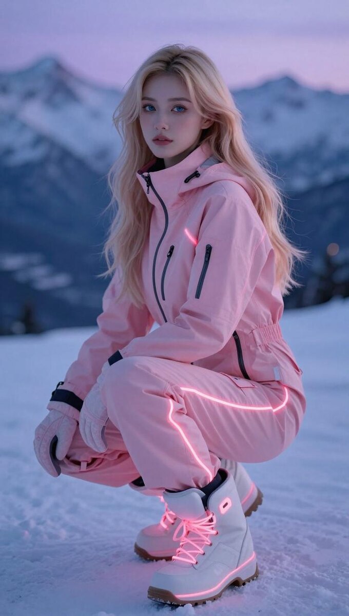 ! ❄️ Сегодня разберём, как создать футуристичный зимний портрет в заснеженных горах. 📝 Оптимизированный промт: medium shot of a young woman with long flowing pastel blonde hair and captivating blue eyes, crouching elegantly in a snowy mountain landscape at twilight. She wears a futuristic sleek pink ski suit with a hood, featuring subtle black zipper details, cargo-style pockets, and glowing neon pink LED strips along the seams. High-top white boots with glowing pink accents and laces, hands covered in soft textured gloves. Soft, natural makeup, calm confident expression. Background: softly blurred alpine winter scene with snow-covered peaks under a cool blue-purple sky, subtle bokeh lights. Soft cinematic golden-hour backlighting highlighting skin, hair, and glossy suit texture. Photorealistic style, ultra-detailed textures (snow, glossy fabric, LED glow), shallow depth of field, emphasis on texture and glow effects, 8K resolution, professional fashion photography 💡 Что изменили и