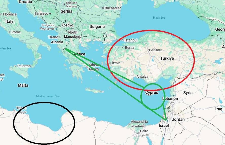 Новый альянс располагается аккурат между ними (обозначил зелёным), осложняя туркам возможность свободной коммуникации. И возможность отрезать Израиль в случае чего от Западного Средиземноморья, потому что и так живем на острове.