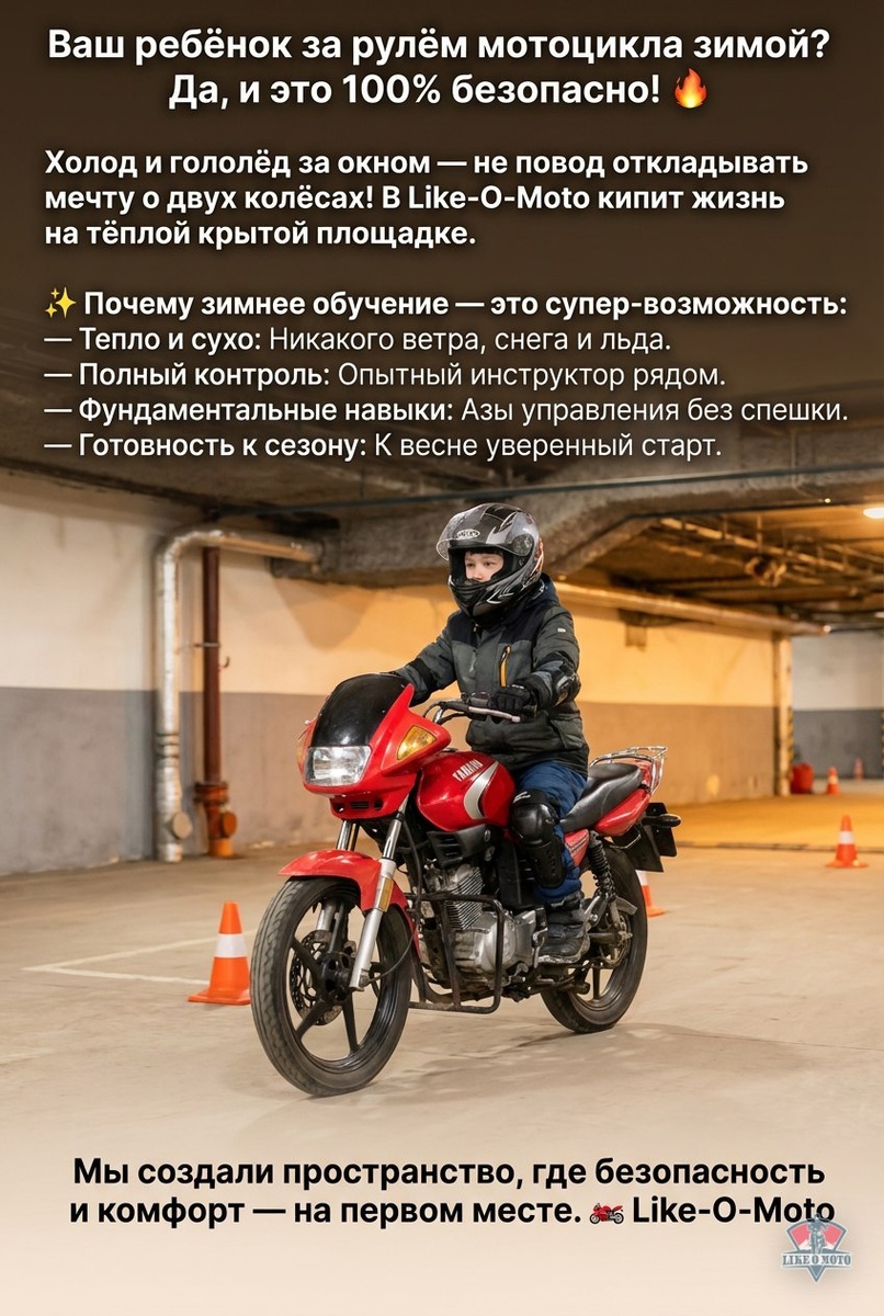 ! 🔥 Холод и гололёд за окном — не повод откладывать мечту о двух колёсах! Пока другие ждут весны, в Like-O-Moto кипит жизнь на тёплой крытой площадке — идеальном полигоне для первого знакомства с мотоциклом. ✨ Почему зимнее обучение — это супер-возможность: – Тепло и сухо: Никакого ветра, снега и льда. Полный комфорт для концентрации. – Полный контроль: Опытный инструктор всегда рядом. Все риски сведены к нулю. – Фундаментальные навыки: Учим азам управления без спешки и стресса от плохой погоды. – Готовность к сезону: К весне ваш ребёнок будет уверенно стартовать, пока другие только начнут теорию. Мы создали пространство, где безопасность и комфорт — на первом месте. Это лучший старт для юного мотоциклиста! Не откладывайте на завтра то, что можно начать сегодня в идеальных условиях! 🏍️