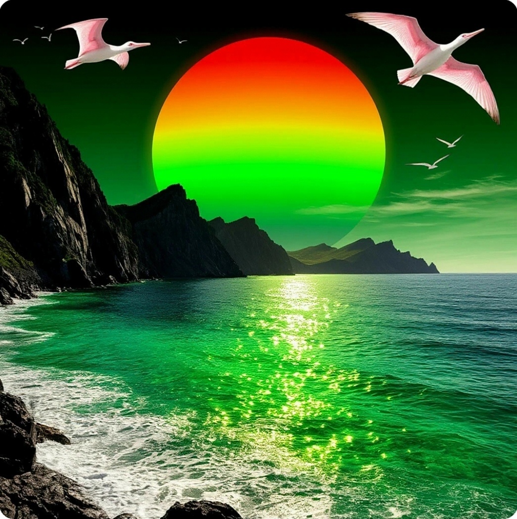 Переливающийся нежно–зелёным со светлой желтизной светом огромный шар Плутона колебался в потоках воздуха на темнеющим красно-коричневый, почти черным морем. Восходящие с моря потоки воздуха причудливо искажали очертания зелёного светила. По позеленевшему громадному диску иногда пробегали прямые и косые радужные волны, потрясающее зрелище завороживало исследователей. Хотелось любоваться и любоваться не отводя глаз. Каштанов и Макшеев доели печеную рыбу, утолили жажду из фляг, не опасаясь остаться без воды имея такою буйную растительность за спиной в глубине страны. Растительность в виде прерии, дальше переходила в одиночные деревья и островки густых зарослей. В темнеющем освещение затмения растительность приобрела синевато–черный цвет с фиолетовым оттенком.