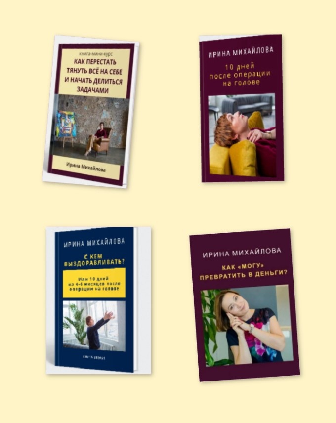 Другая моя книга «Как превратить «могу» в деньги?» содержит упражнение с примером Чебурашки, который много чего умел. Ссылка на нее:https://www.litres.ru/book/irina-mihaylova-33101779/kak-mogu-prevratit-v-dengi-70894903/ Две другие книги про операцию на мозге, которая у меня была, что я делала. Первую, «10 дней после операции на голове», можно найти по ссылке: https://www.litres.ru/book/irina-mihaylova-33101779/10-dney-posle-operacii-na-golove-72880582/
