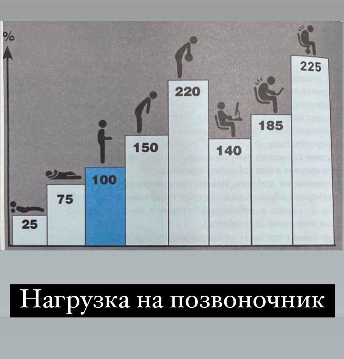 ?❗️ 📚 Шведский хирург-ортопед Альф Нахемсон, посвятил много лет исследованиям давления в межпозвонковых дисках при различных нагрузках. ⁉️В этих дисках и появляются «грыжи позвоночника» 🔬 Он измерял внутридисковое давление в зависимости от положения туловища человека. 🔍 Что у него получилось❔ 📌 При положении лёжа на спине - позвоночник испытывает нагрузку в 25% от его собственного веса. 📌 Когда мы стоим - 100% 📌 Сидя - 140%, 📌 Сидя согнувшись - 185% ❗️ Выводы: ✅ сидите ровно, для этого настройте спинку стула в более вертикальное положение ✅ хотя бы раз в час или два вставайте со своего рабочего места! И вопрос с грыжами будет беспокоить Вас значительно меньше или вы забудете про него совсем 👍 Будте здоровы 💪