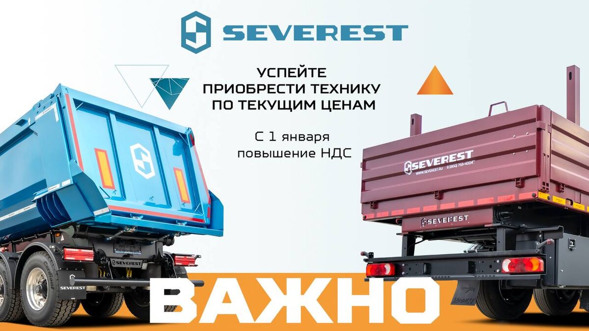 ! 📣 🗓 До Нового года осталось совсем немного времени, и мы хотим предупредить вас о важном изменении, которое повлияет на стоимость нашей техники! ⚠️ С 1 января произойдёт повышение НДС! ⚠️ Это значит, что цены на нашу продукцию неизбежно вырастут. Если вы давно планировали приобрести технику SEVEREST, сейчас самое удачное время для покупки! 💰 ✨ Почему стоит поторопиться? ✅ Сохранить текущие выгодные цены. ✅ Избежать дополнительных расходов из-за повышения НДС ✅ Стать обладателем качественной техники от надёжного производителя без лишних затрат 🔔 Не откладывайте решение! Мы ждем Ваших звонков: 📱Телефон: 8-800-775-33-00 🌐 Сайт: severest.ru SEVEREST - быть сильнее обстоятельств! #severest #лизинг #ндс #спецтехника #полуприцеп #урал #камаз #faw #shacman