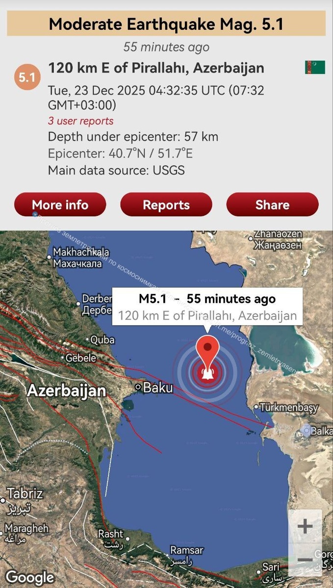 Согласно предупреждению от 18 декабря Каспийское море отработало событием М5.1