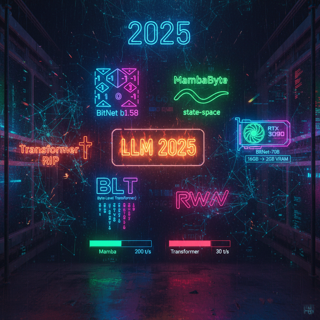 Microsoft BitNet (-1,0,1 вместо 16-бит), Meta BLT (байты вместо токенов), MambaByte (500x быстрее). Зачем они убивают Transformer и как запустить на RTX 3090? Transformer мёртв? Почему все бегут от attention Transformer = вчера. 16-битные веса жрут VRAM, inference тормозит, обучение — месяцы на H100 кластерах. 2025 тренд: Linear альтернативы. Смотрим топ-3 убийц Transformer из твоего анализа: 1. BitNet b1.58 — Microsoft 1.58-bit LLM Llama-3-8B FP16: 16GB VRAM BitNet-3B: 2.3GB VRAM (10x меньше!) MMLU: 71% vs Llama-3B 68%