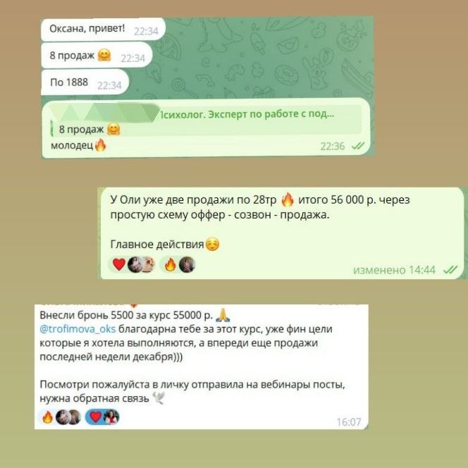 С 1 по 11 декабря я провела ПРАКТИКУМ «Продажи без хаоса: 3 связки для быстрых продаж в декабре». Мы работали не про вдохновение и не про «надо больше стараться». В Практикуме разбирали конкретные связки, которые можно взять и внедрить сразу, получить заявки не откладывая. Самые активные участники смогли занять места с 8 по 14 декабря в 4 поток Практикума «Продажи по-Любви» где получали заявки, оплаты, реализовывали идеи продуктов через быстрые связки в коммуникациях - созвонах и переписках ▫️Психолог и энергопрактик продажа 8 мест за 1 день на 15 000 ₽ через пост и усиленный оффер ▫️Психолог, женский ментор 3 продажи на 113 000 ₽ через созвоны - интервью ▫️Эксперт по визуалу впервые сделала 3 продажи курсов через созвон и докрученный оффер ▫️Энергопрактик за 2 дня собрала 25 заявок в закрытой связке через переписку ▫️Методолог 8 заявок и предоплата на личную работу через сильный оффер и созвон У всех участников Практикума: 🧥заявки с постов и назначенные консультации 🧥переписка с н