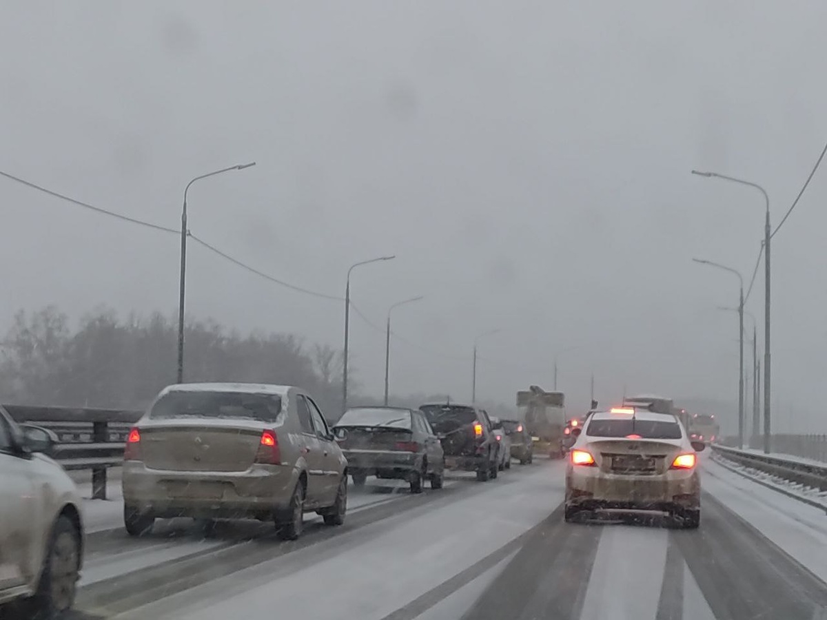 Пробка на Северке в сторону Канищева. Поворот на Борки тоже стоит. Сразу видно, что зима пришла в Рязань.
