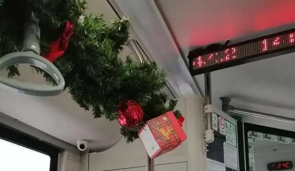 \"Транспорт украшен снежинками и изображением символа наступающего года — огненной лошади. Внутри салонов также создана праздничная атмосфера. Это наш подарок пассажирам, чтобы поездка приносила улыбки и радость в преддверии Нового года", — отметили в компании.