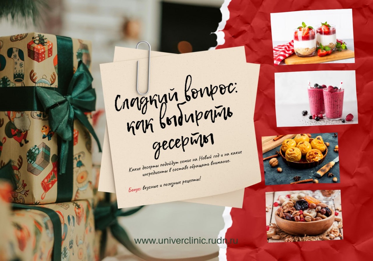 ? Новогодние подарки всегда про вкусные наполнения: конфеты в сверкающих фантиках, ароматные плитки шоколада, мармелад... Но даже в столь радостные дни нужно помнить о правильном выборе десертов. Простыми и безопасными советами по выбору сладостей, особенно для детей, делится наш врач-эндокринолог, заведующая эндокринологическим отделением Университетского клинического центра им. В.В. Виноградова (филиал) РУДН Евгения Игоревна Лучина. ✨Слишком много добавленного сахара повышает риск кариеса, лишнего веса, проблем с концентрацией и настроением. А детям особенно важно получать витамины, белок и клетчатку, а не только "пустые" калории. И нужно помнить: что главный Враг - не Сладость. А количество сладостей✨. ➡️ Чего избегать в первую очередь: 👆сахарные напитки (соки из пакетов, газировка, лимонады); 👆конфеты и леденцы с чистым сахаром, карамель; 👆промышленные десерты с высоким содержанием гидрогенизированных жиров и фруктозо-глюкозного сиропа. Советы при выборе сладостей: 1️⃣Отдава