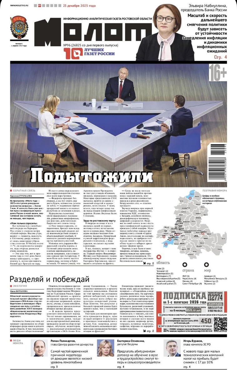 »: 📌Подытожили На программу «Итоги года с Владимиром Путиным-2025» поступило рекордное количество вопросов — более 3 млн. Среди 600 аккредитованных журналистов оказалась главный редактор «Молота» Каролина Стрельцова. И хотя это была уже шестая пресс-конференция президента России в ее жизни, впечатлений она оставила ничуть не меньше, чем первая. 📌Есть что строить В Аксайском районе за 22,6 млрд рублей строят крупнейший в регионе тепличный комплекс, где собираются ежегодно выращивать 43 тыс. т огурцов. Это будут многопролетные теплицы со стеклянным покрытием и системой ассимиляционного досвечивания на площади 33 га. Подробности читайте у Елены Бондаренко. 📌«Кадриль моя, новочеркасская...» Худрук и солистка ансамбля русских народных инструментов «Донцы» Ростовской филармонии Елена Котельникова вошла в число 35 деятелей культуры России, награжденных в Москве медалью Александра Твардовского. Журналист «Молота» Виктория Головко спросила ее, с чего начались поездки на прифронтовые терри
